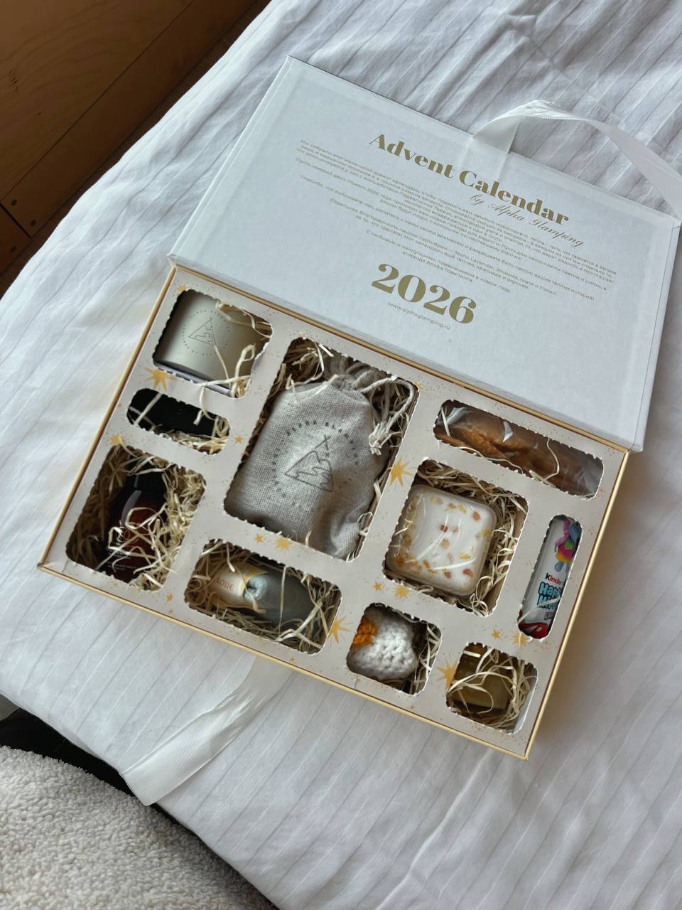 Внутри календаря — 10 ячеек с подарками и приятными мелочами для зимних вечеров. Мы наполнили его вещами, которые помогают замедлиться и почувствовать заботу: ароматные свечи, чай, сладости, элементы для домашнего уюта и небольшие подарочки от нашей команды.